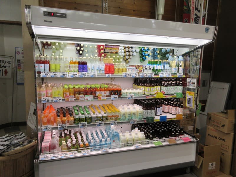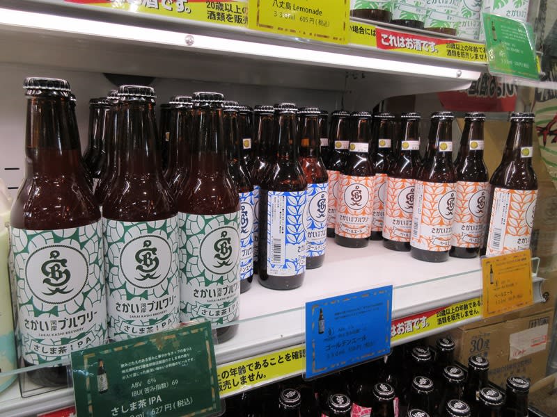 店内の冷蔵庫を発見。ありました、さかい河岸ブルワリーの瓶ビール販売コーナーが。しかも種類が多いです。全部飲めないので、気になるビールを購入し、先ほどの外のテーブルへ。