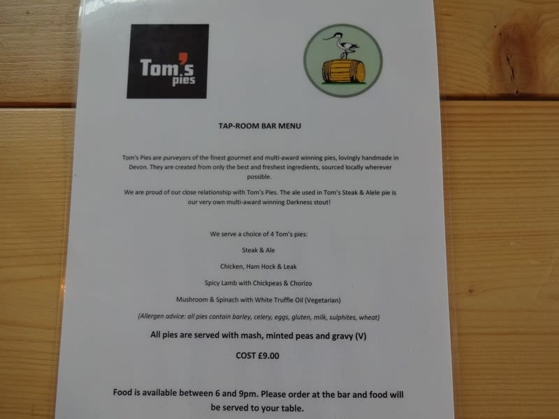 フードのメニューです。6時から9時までに注文可能な限定メニュー。提供されているのは地元の手造りのパイ。4種のパイから選べます。説明書きを読んでいると、こだわりがあって美味しそうです。