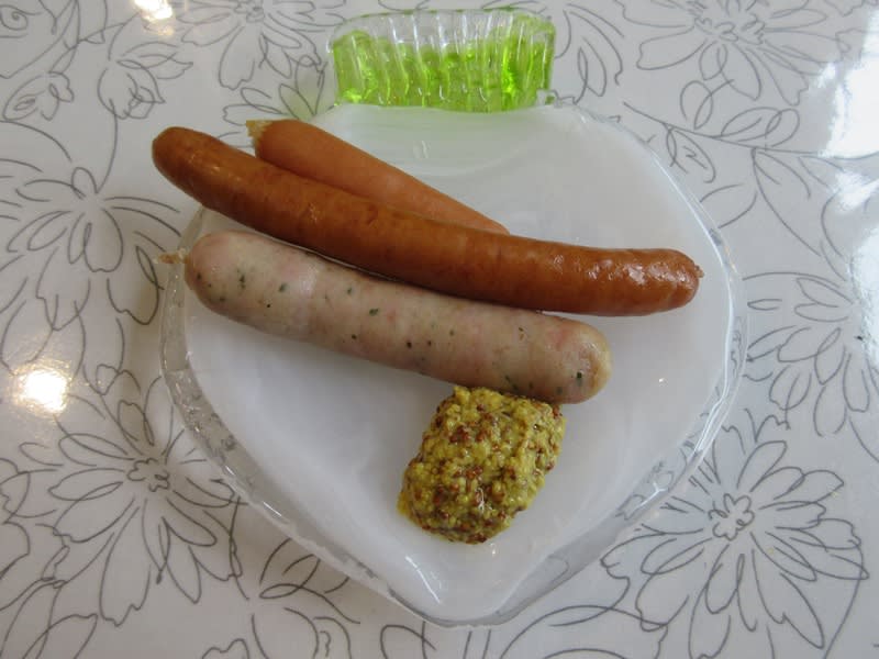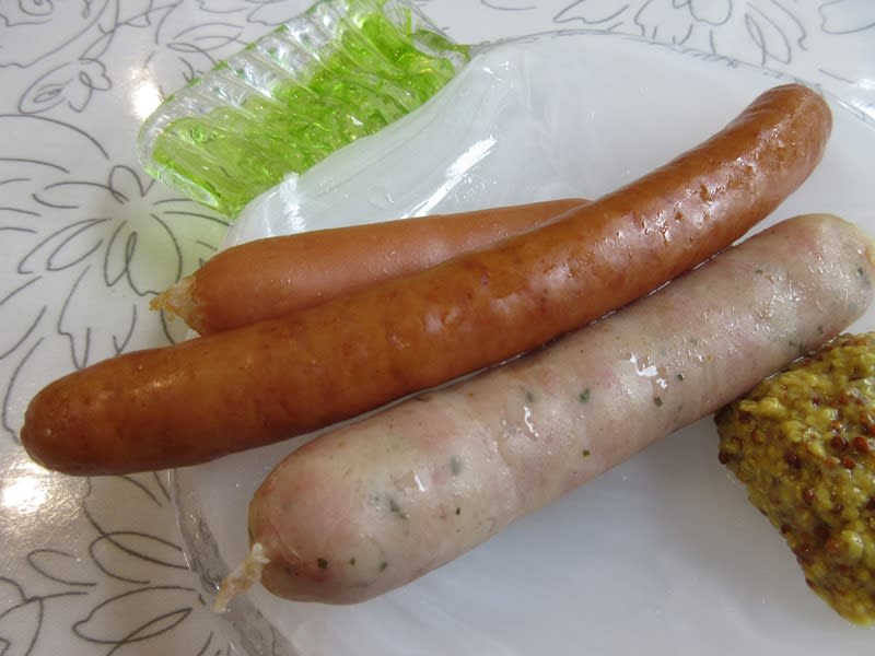 こちらは「ソーセージ盛り合せ」。お皿もガラスなので、こちらで製作されたものかな。塩味やハーブ感よりも肉の旨味を楽しむボックブルストです。