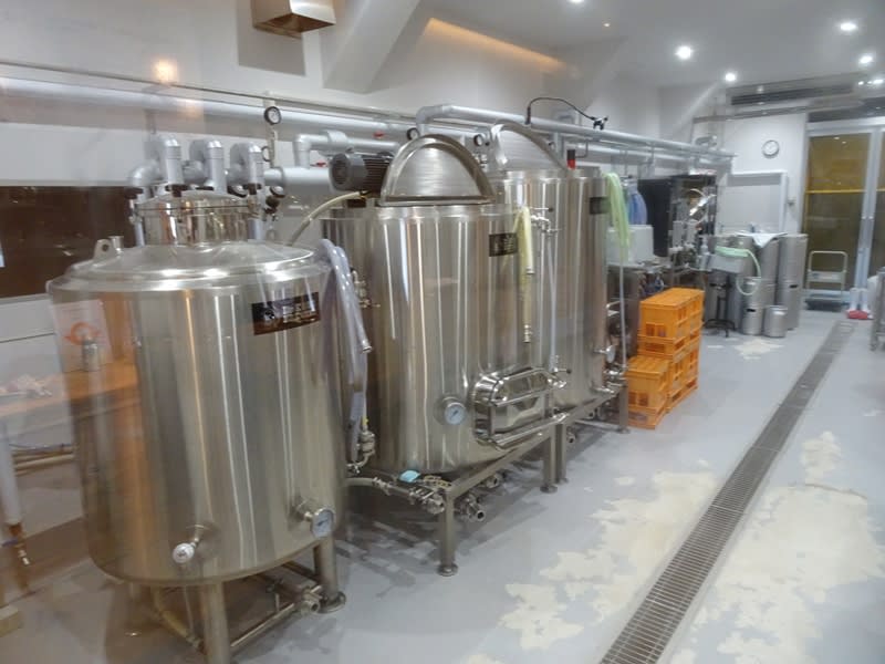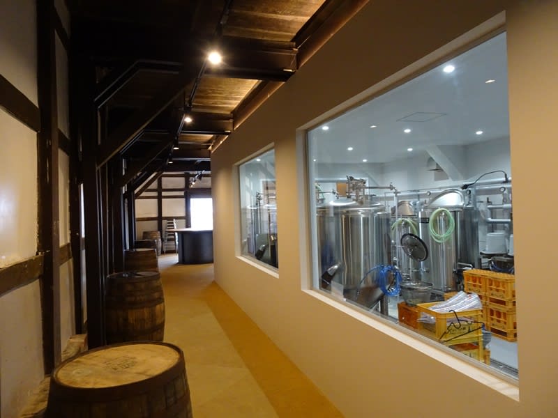 スタッフの方のご厚意で、醸造所を見せていただきました。ビールの醸造所は隣の建物でした。これまた魅せる空間に。