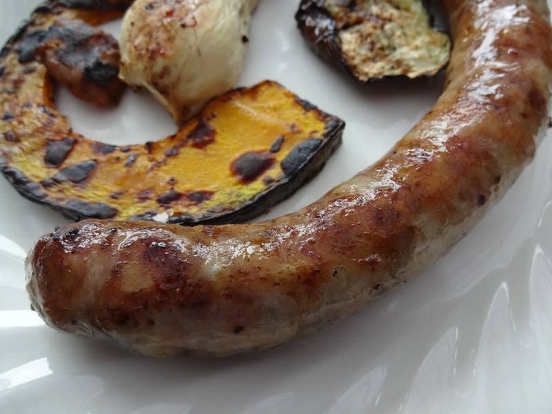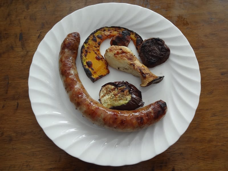 ソーセージが焼けました。粗挽きのロングソーセージで、食べ応えがあります。野菜は焼き過ぎたかな。