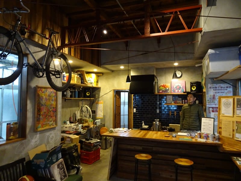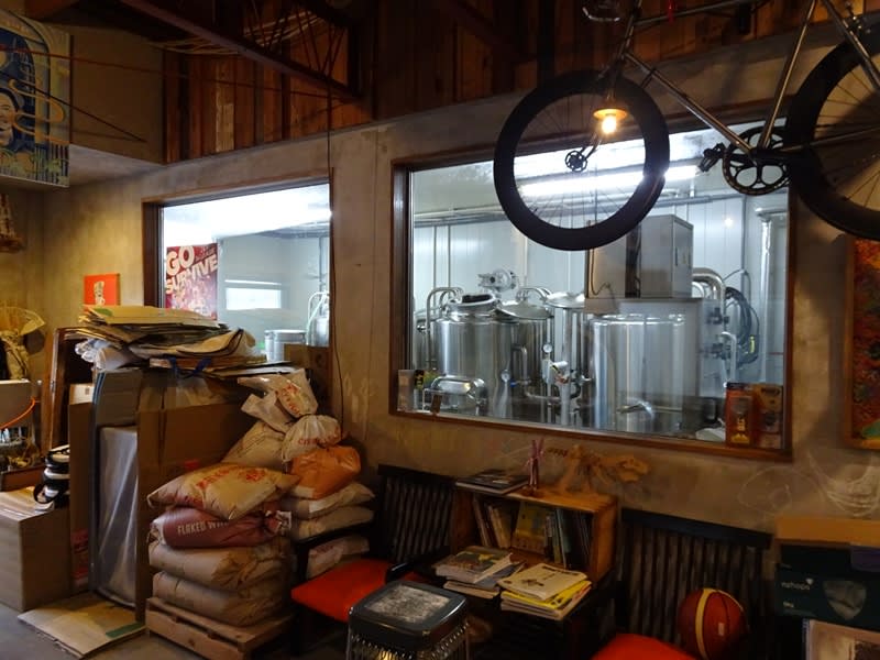 店内の様子。雑多とモノが置かれていますが、全体的に作り手の方の世界観が伝わってくる店内です。入って左側は醸造スペースになっています。仕込みの規模は250Lですが、発酵タンクは500L。よって基本はダブルバッチだそうです。