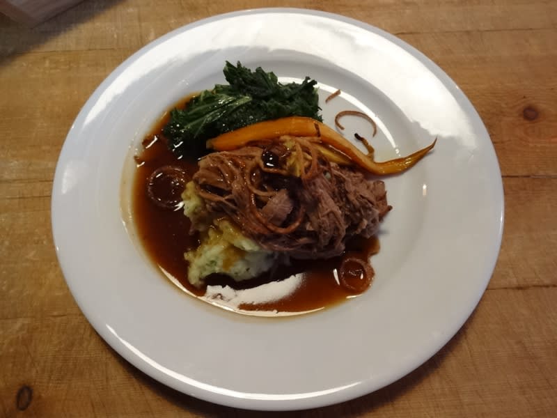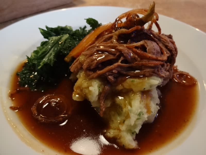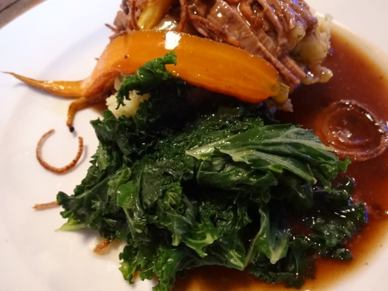 「ビーフ・リブの蒸し煮。マッシュポテト、人参、ケール添え」といった感じでしょうか。これらの素材は地元のものだそうです。この一皿が非常に美味しい!お肉やマッシュポテトがオニオンの効いたグレービーソースと相まって美味。たっぷりな野菜の付け合わせが嬉しい。塩味・酸味・旨味・香りのバランスが素晴らしい一品。
