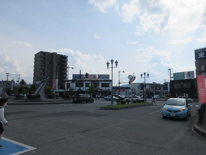 JR米沢駅と駅前の様子。駅舎は古くないながらも、味のある建物で風情があります。近年は駅舎が画一的な感じになっているなか、個性的です。