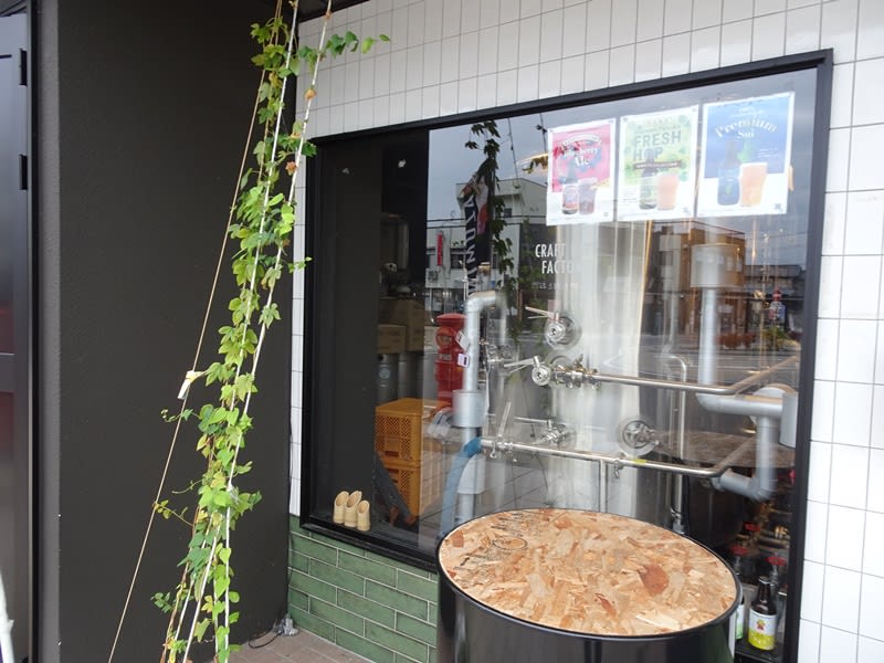 駅前の建物の1階部分が醸造所兼タップルーム。ガラス越しに醸造設備を確認できます。その傍らにはさりげなくホップが植わってました。