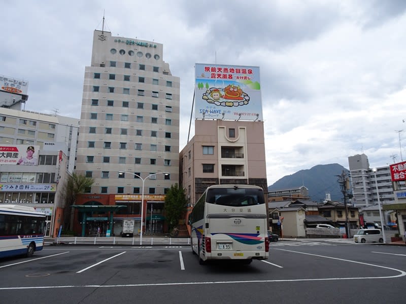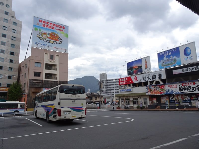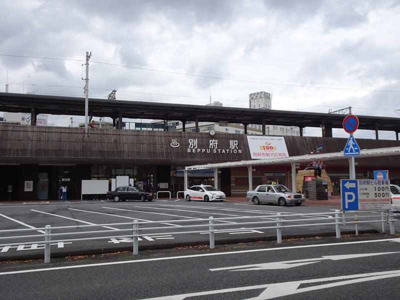 別府駅と駅前の様子。別府温泉は市内に広がる広大な温泉地。その玄関口なので、多くの観光客で賑わっています。