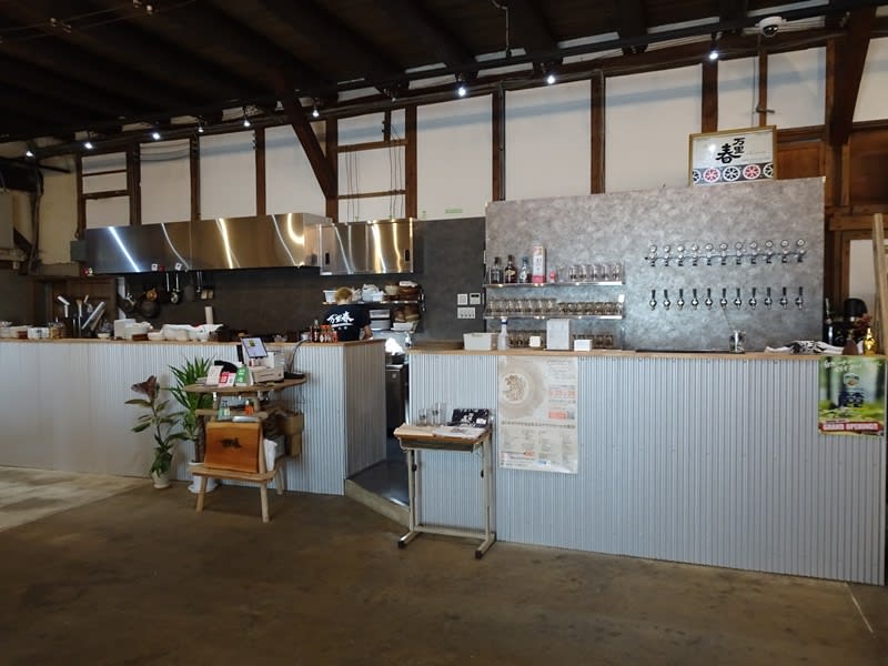 店内の様子。元日本酒の蔵らしく天井の立派な梁が印象的な木をベースとした店内です。天井も高く開放的で、「ビアホール」と称するのも分かります。店内の端に醸造所が見える小窓があります。