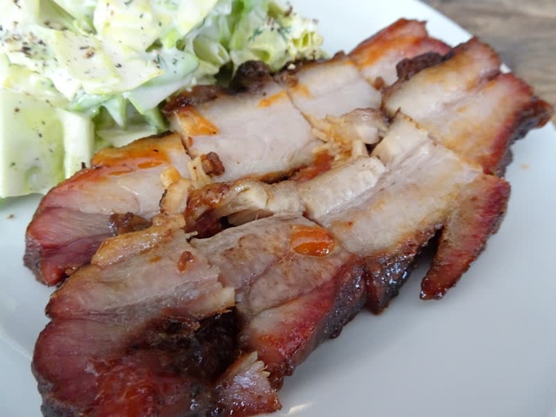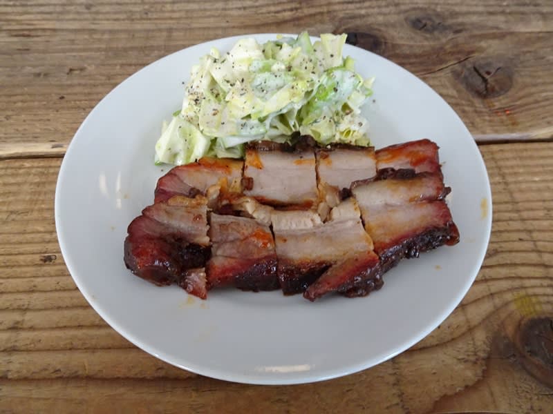 フードは「無農薬キャベツコールスロー」と「ポークベリー」を注文。ワンプートでサービング。ポークベリーは豚バラのローストで、やや甘いソースとスパイスの香りのライトな味わい。辛いソースをかけるとさらに美味しい。コールスローは胡椒とマヨネーズしっかり目のオツマミにもなる一品。