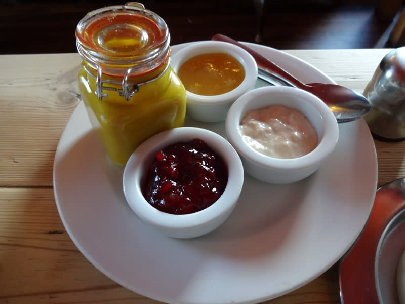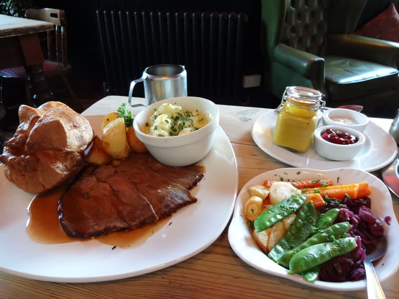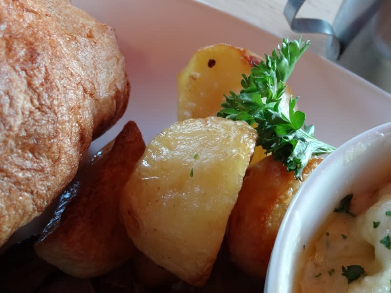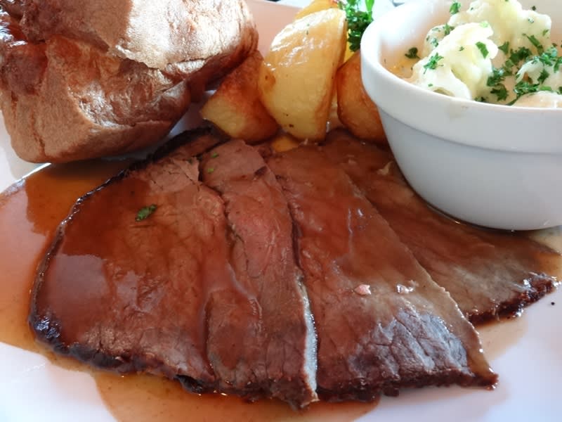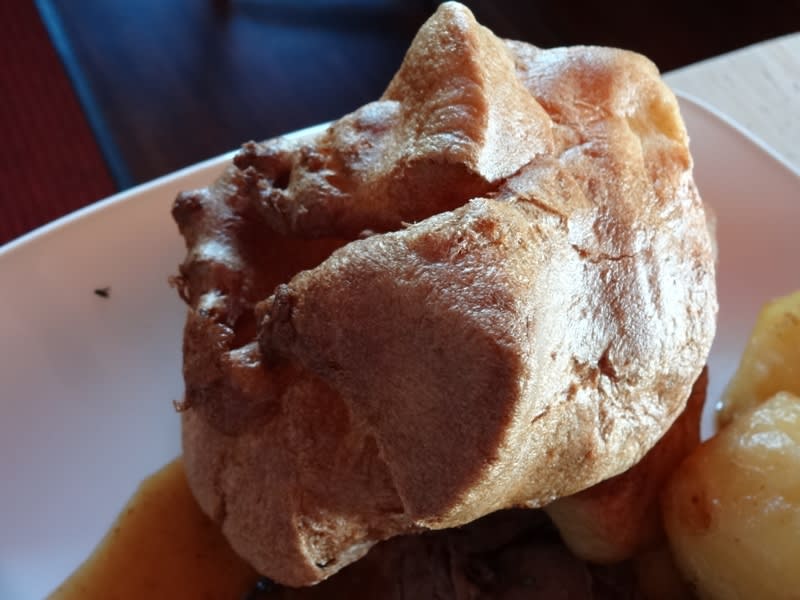 こちらは付け合わせのヨークシャープディング。見た目のまんま、シュークリームの皮です。本場ヨークシャーのそれとは全くの別物。南の方ではこのように解釈されているようです。これにグレービーソースをからめてビーフと一緒に食べると味わいに幅が出ます。